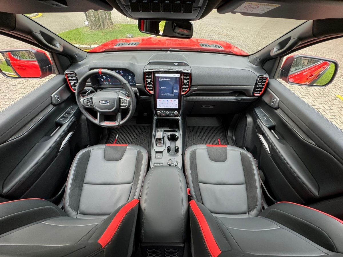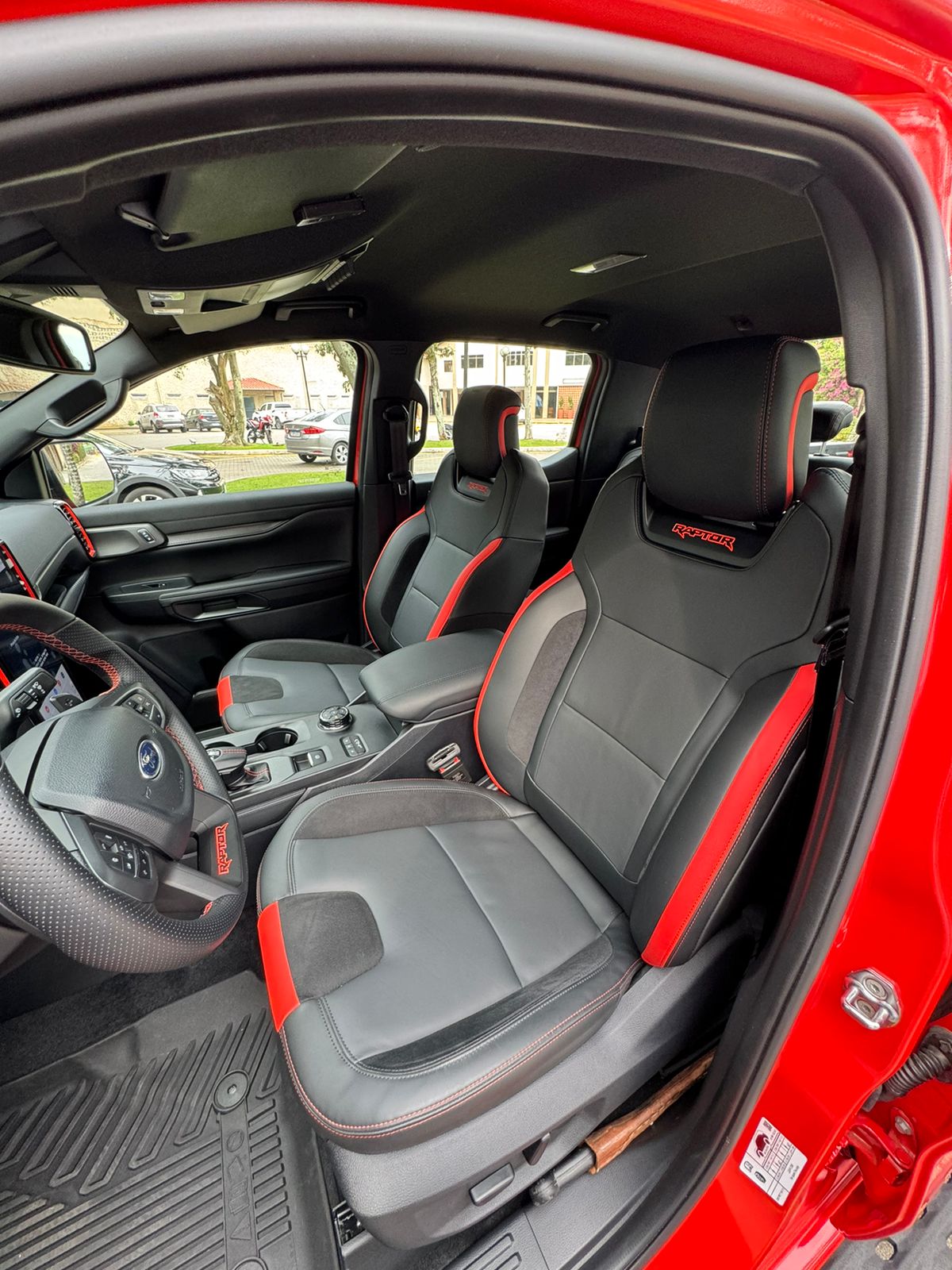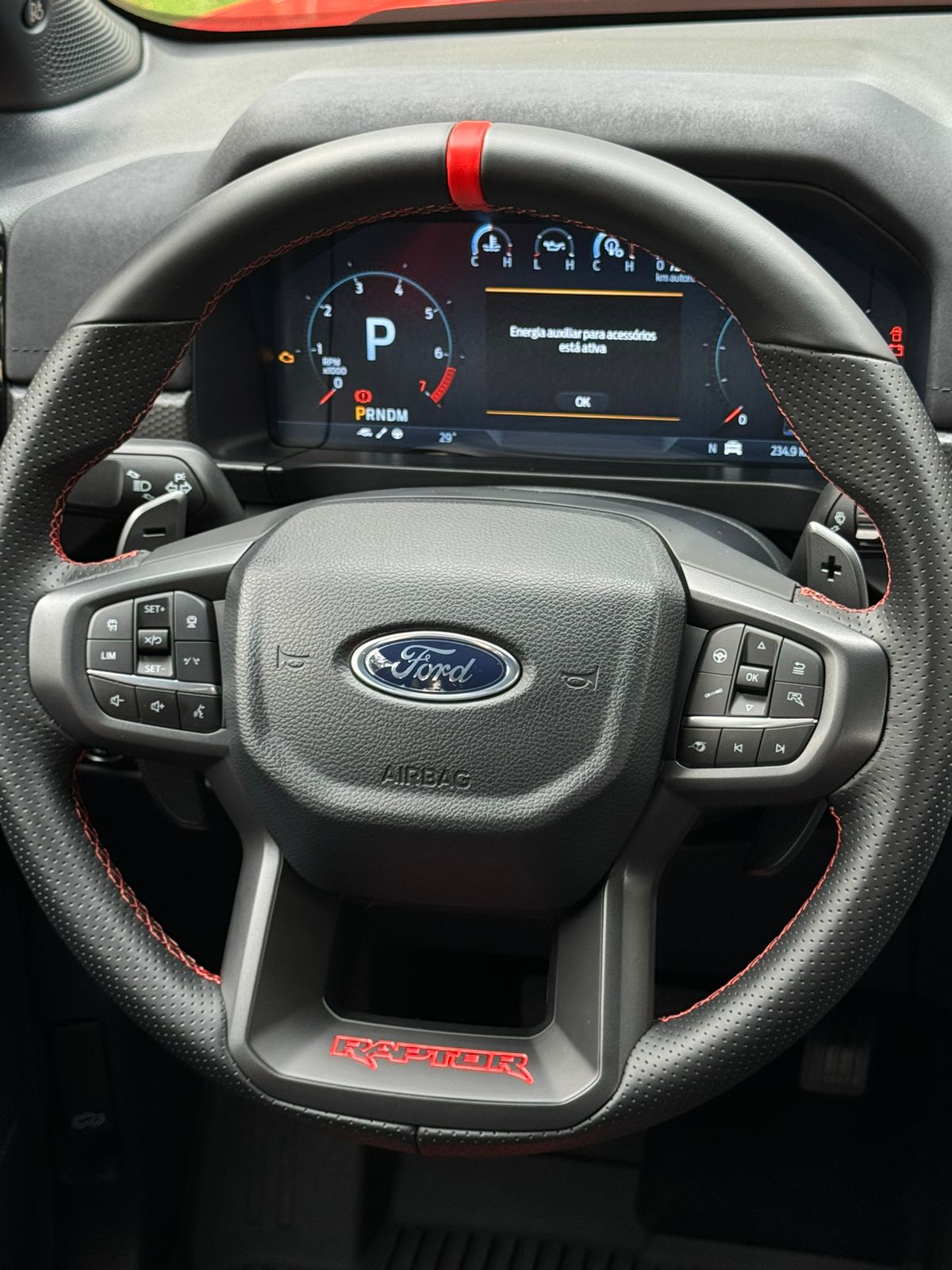 Retrovisores externos elétricos, rebatíveis, aquecimento e luz cortesia bancos exclusivos Raptor com ajuste elétrico e aquecimento Painel digital 12.4"