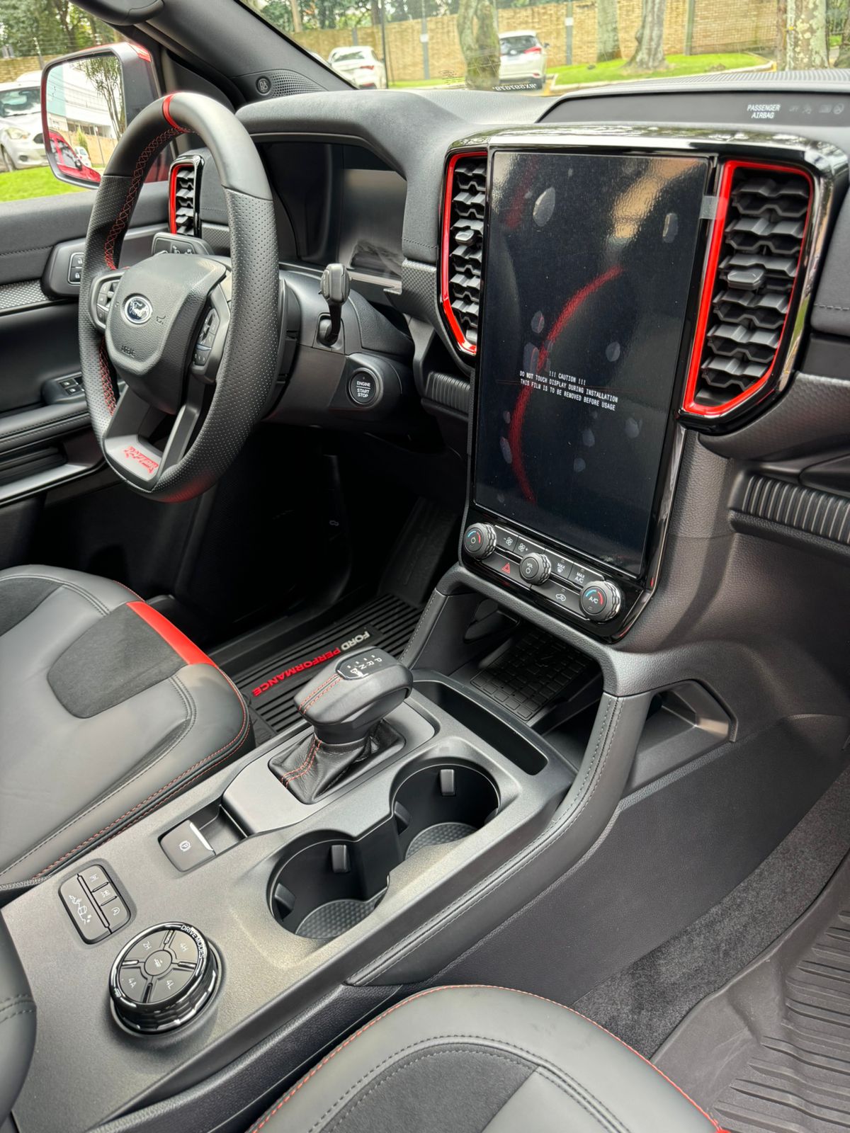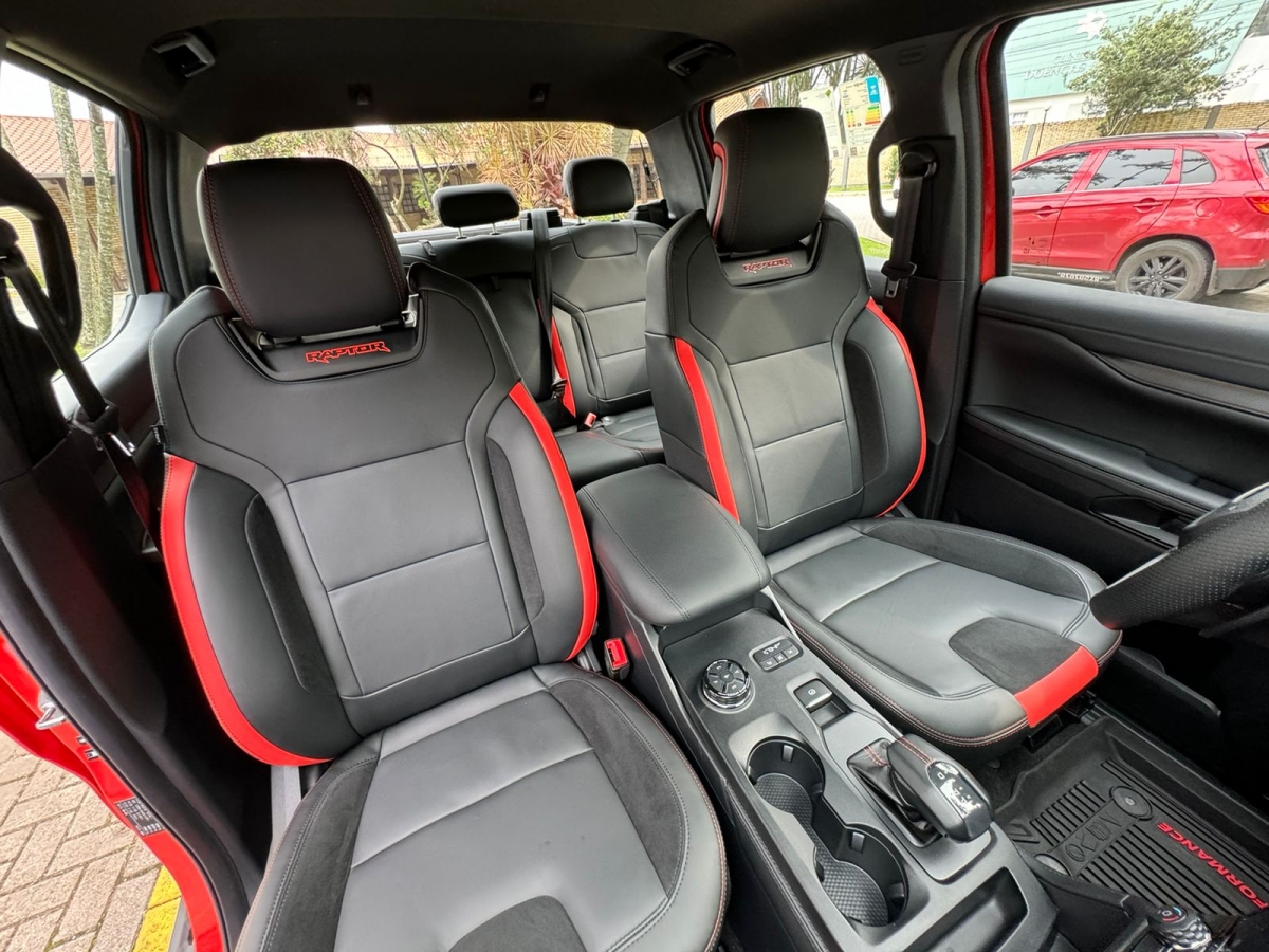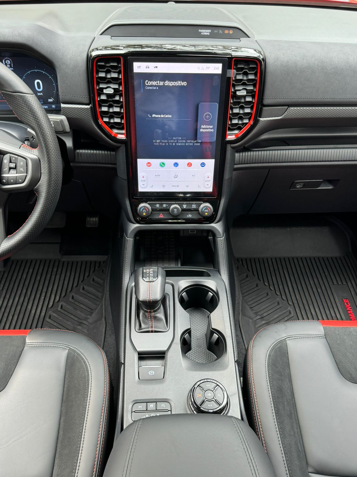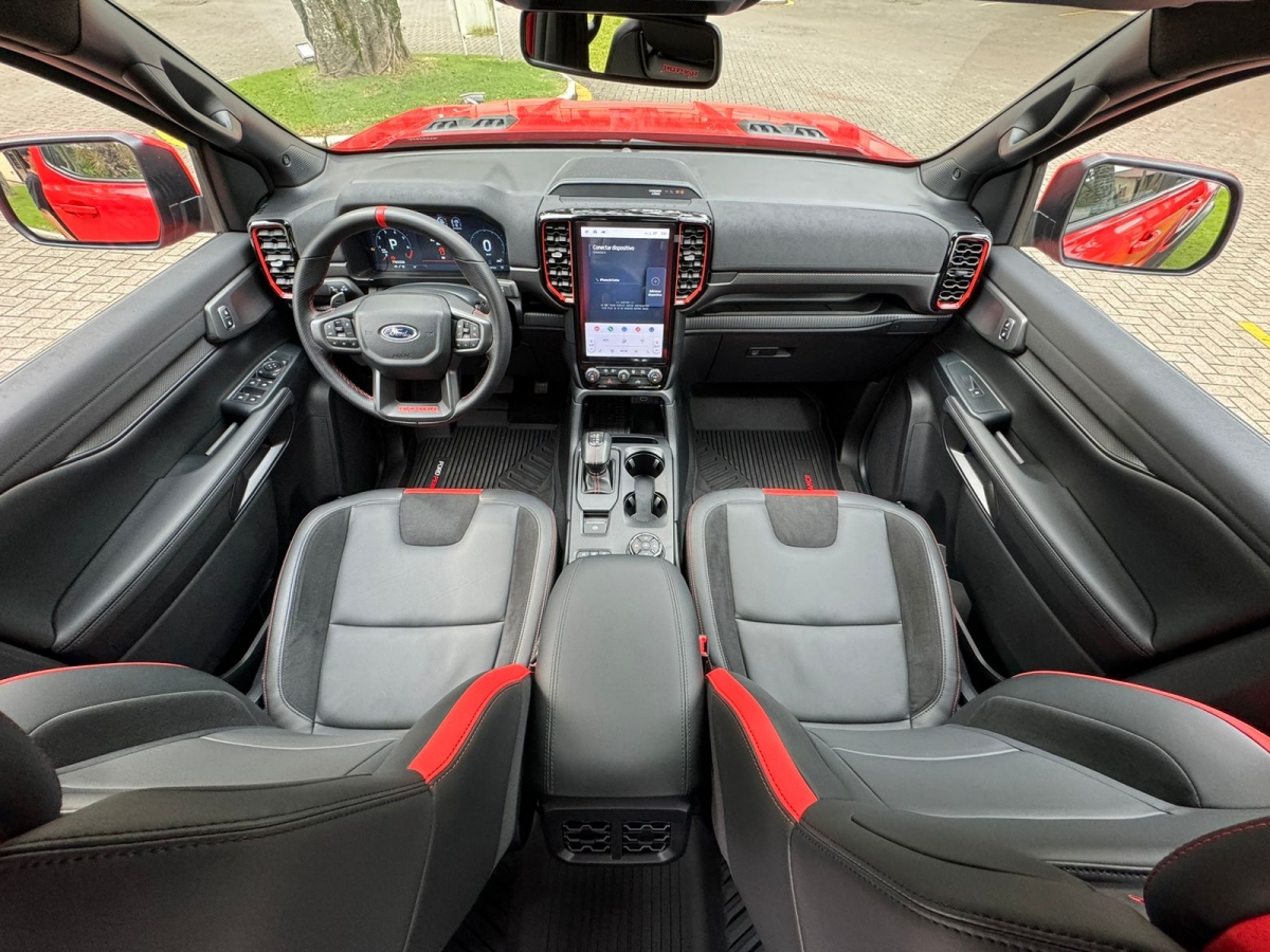 Retrovisores externos elétricos, rebatíveis, aquecimento e luz cortesia bancos exclusivos Raptor com ajuste elétrico e aquecimento Painel digital 12.4"